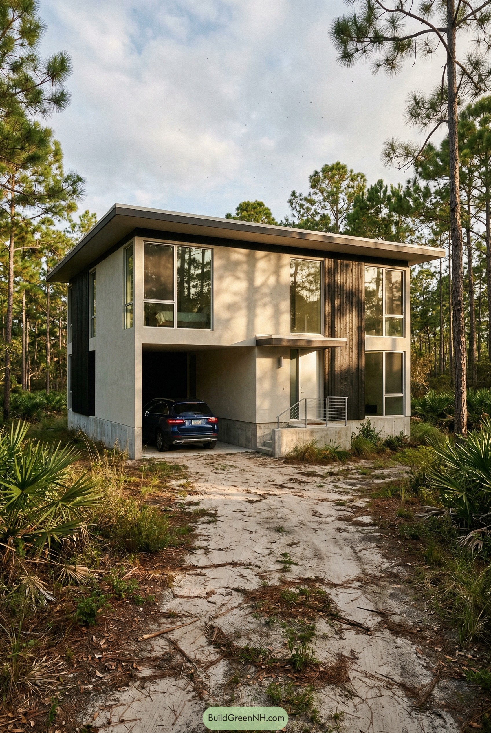 We tucked the carport under the main volume to keep the footprint compact and lift the living spaces a bit above the sandy ground, which Florida tends to rearrange whenever it feels like it. Vertical dark siding at the entry adds warmth and a touch of contrast, guiding you to the front door while those big windows frame just enough forest to make morning coffee feel like a tiny vacation.