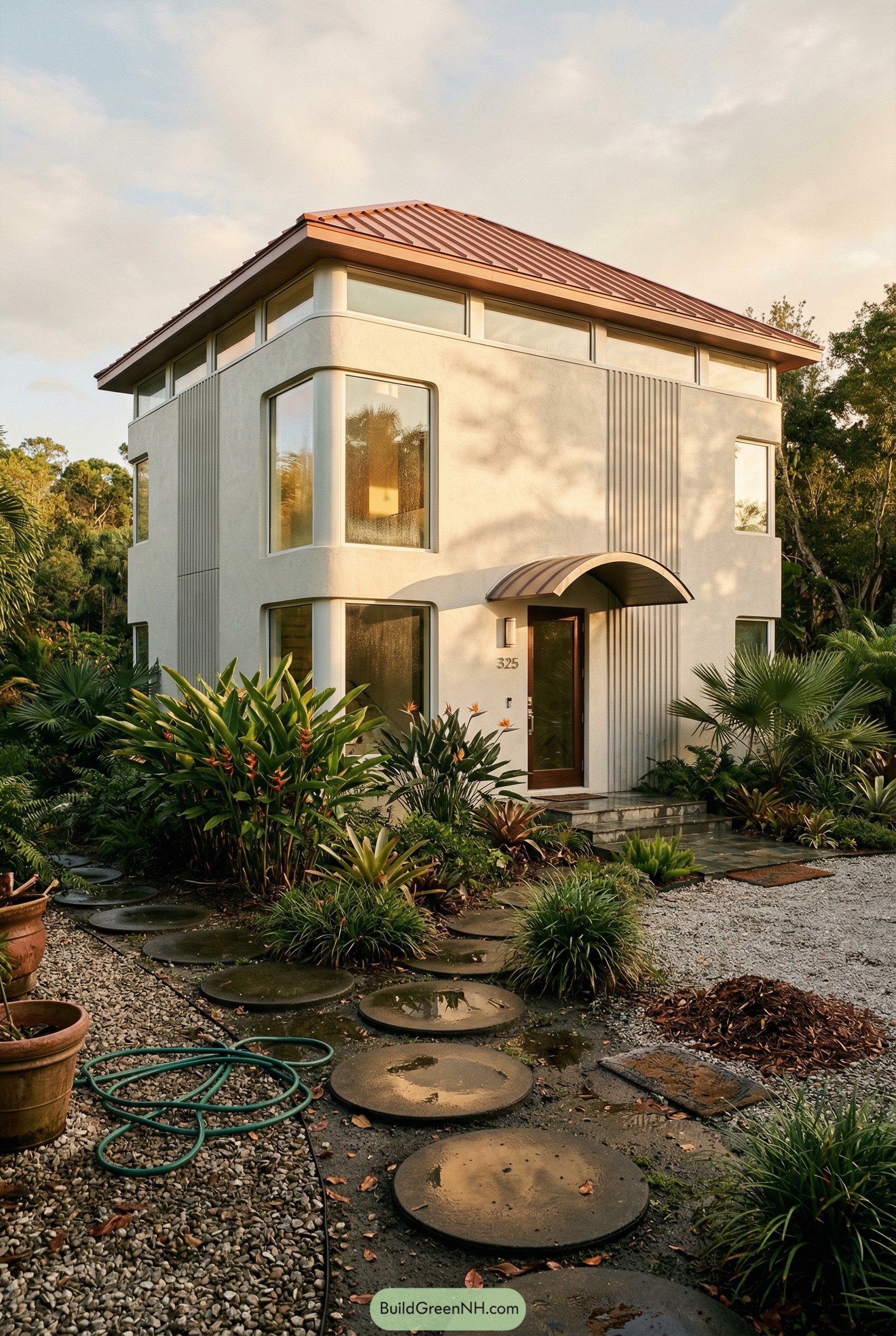 This tall, slim home leans into a clean stucco shell that wraps around big corner windows, so the rooms feel like they’re floating in the garden. The coppery metal roof and curved entry canopy nod to classic Florida porches but in a sleeker, more tailored way that holds up nicely on a stormy afternoon.