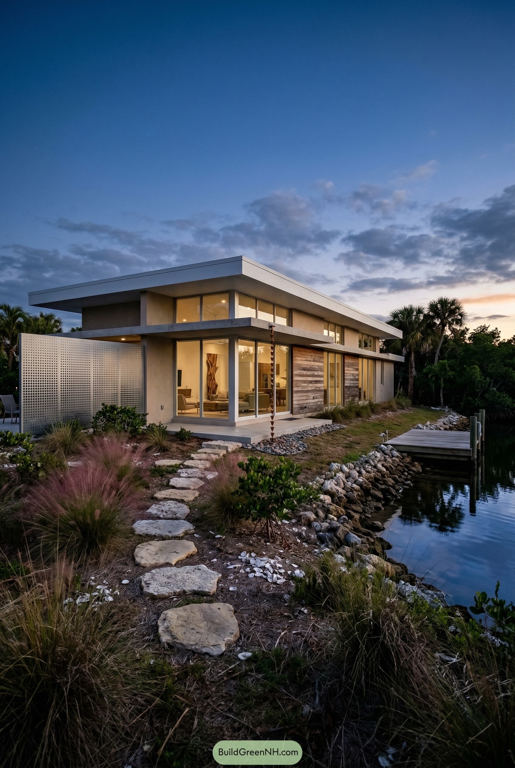 We pulled the house close to the shoreline so the dock, stone path and native grasses feel like part of the living space, not just background scenery. Tall windows wrap the corners, which means sunrise coffee and sunset lounging both get front row seats, and the perforated privacy screen quietly protects outdoor seating while letting breezes sneak through like they own the place.