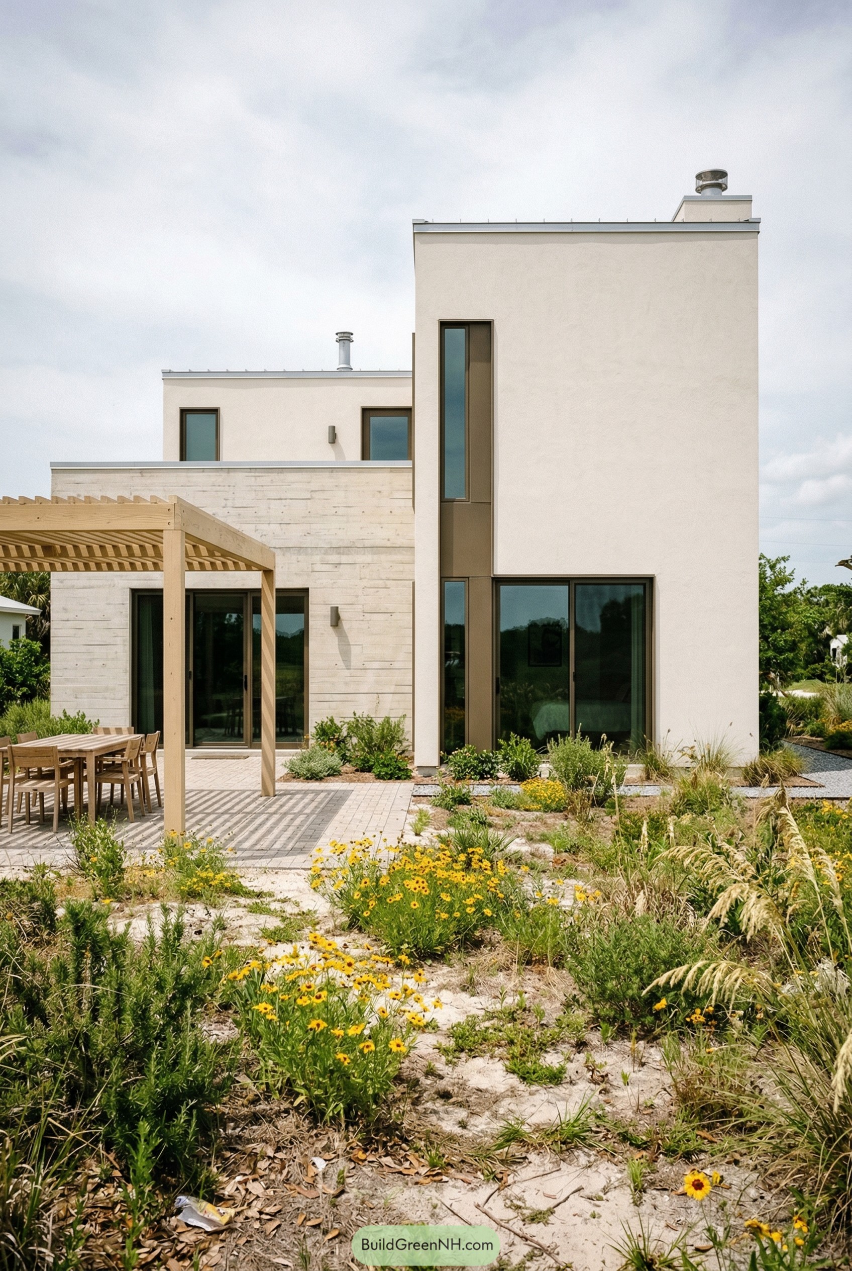 Out front, the light wood pergola and dining set keep everything relaxed and unfussy, more backyard cookout than glossy showroom, which is exactly the point. Native plantings drift around the pavers and sandy soil so the house looks like it grew there on purpose and needs less pampering than your average Florida lawn.