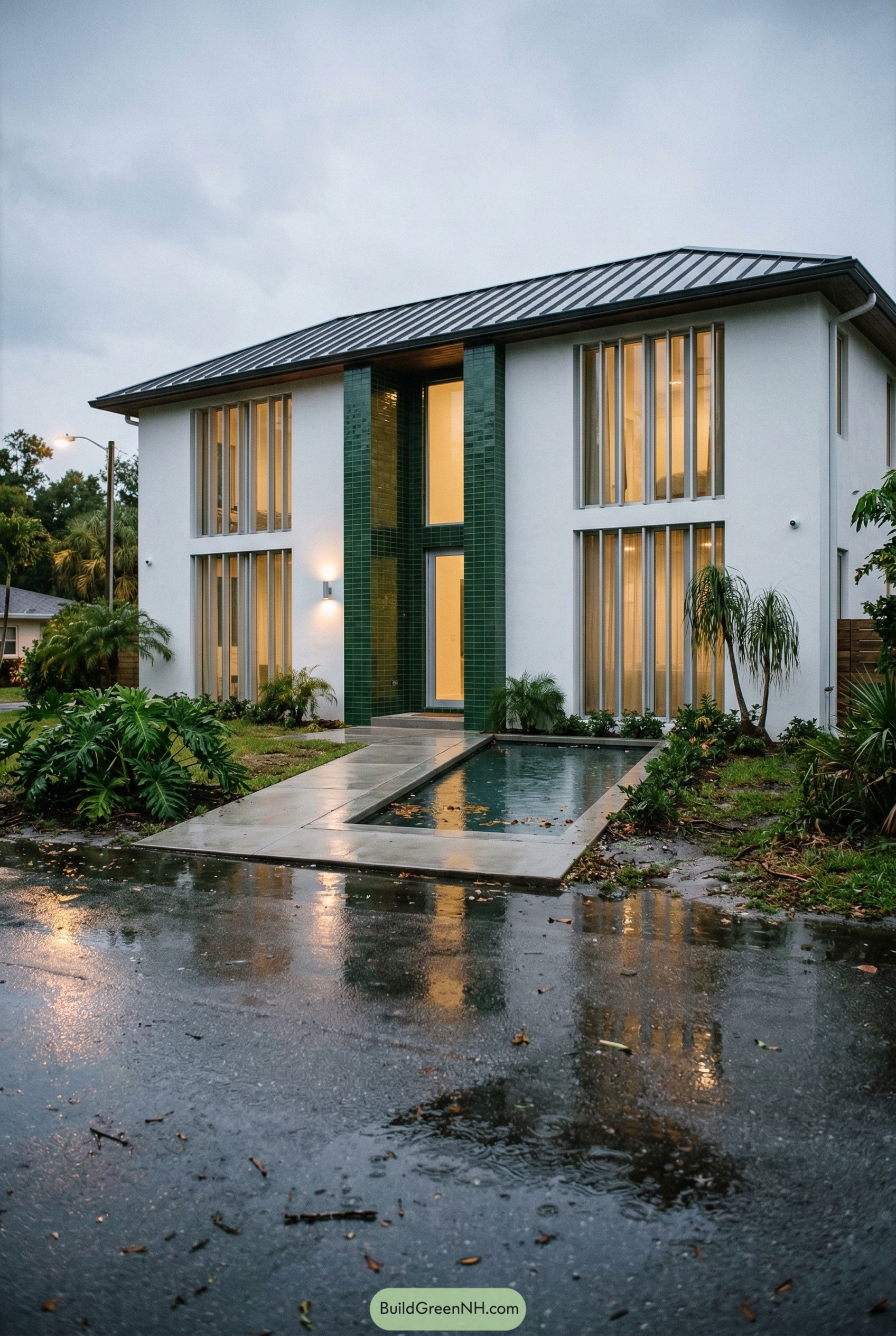 Out front, the linear reflecting pool quietly guides you to the door and cools the whole composition in a way that feels a little resort and a little secret hideout. A low sloped metal roof, tucked lighting and tight tropical planting keep the whole place practical for summer storms yet still looking like it dressed up for a night out.