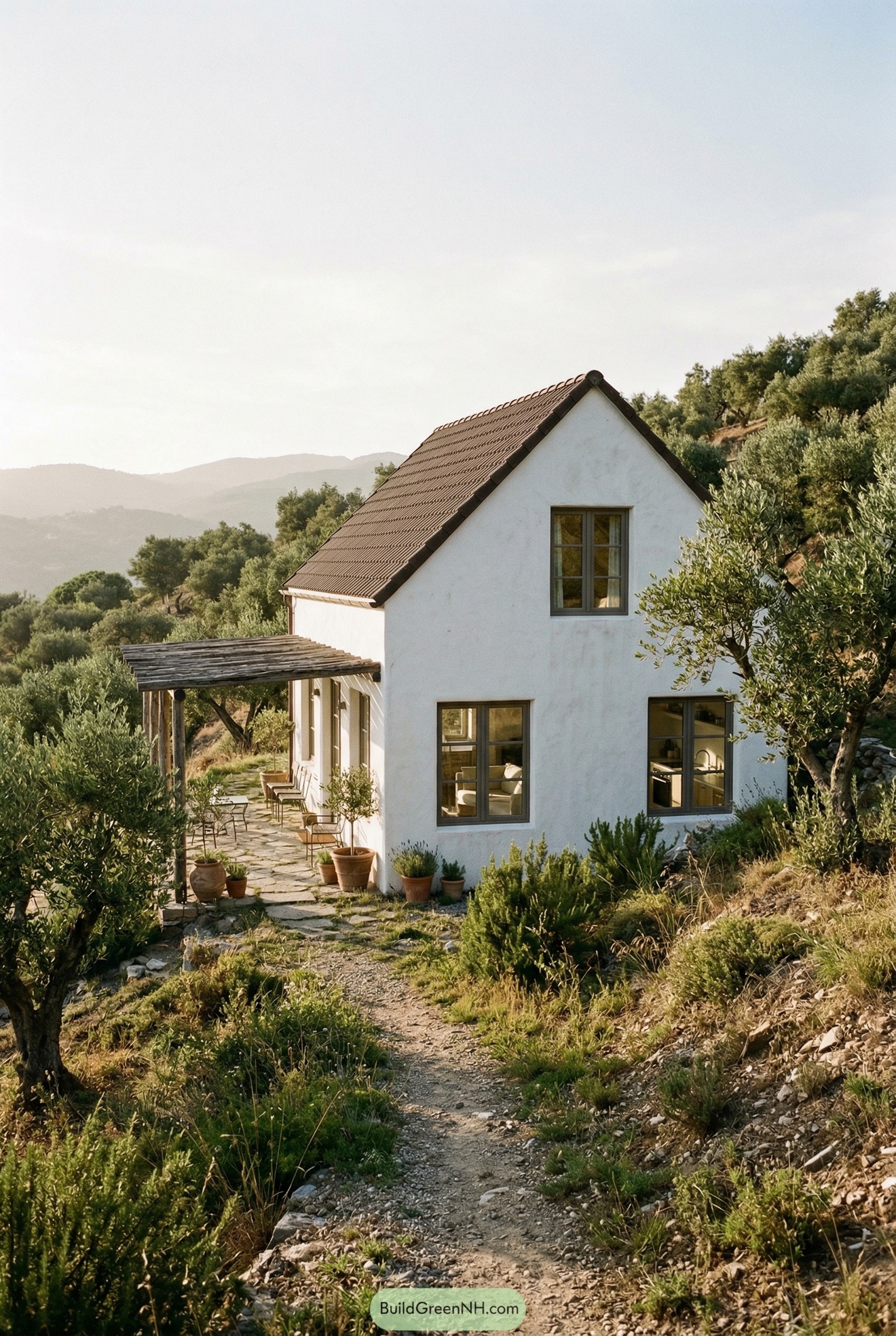 This cottage borrows its calm from Mediterranean farmhouses, with simple white stucco walls and a steep gable roof that feels almost childlike in its clarity. Warm wood-framed windows soften the look and quietly invite the surrounding olive trees to feel like part of the living room furniture.