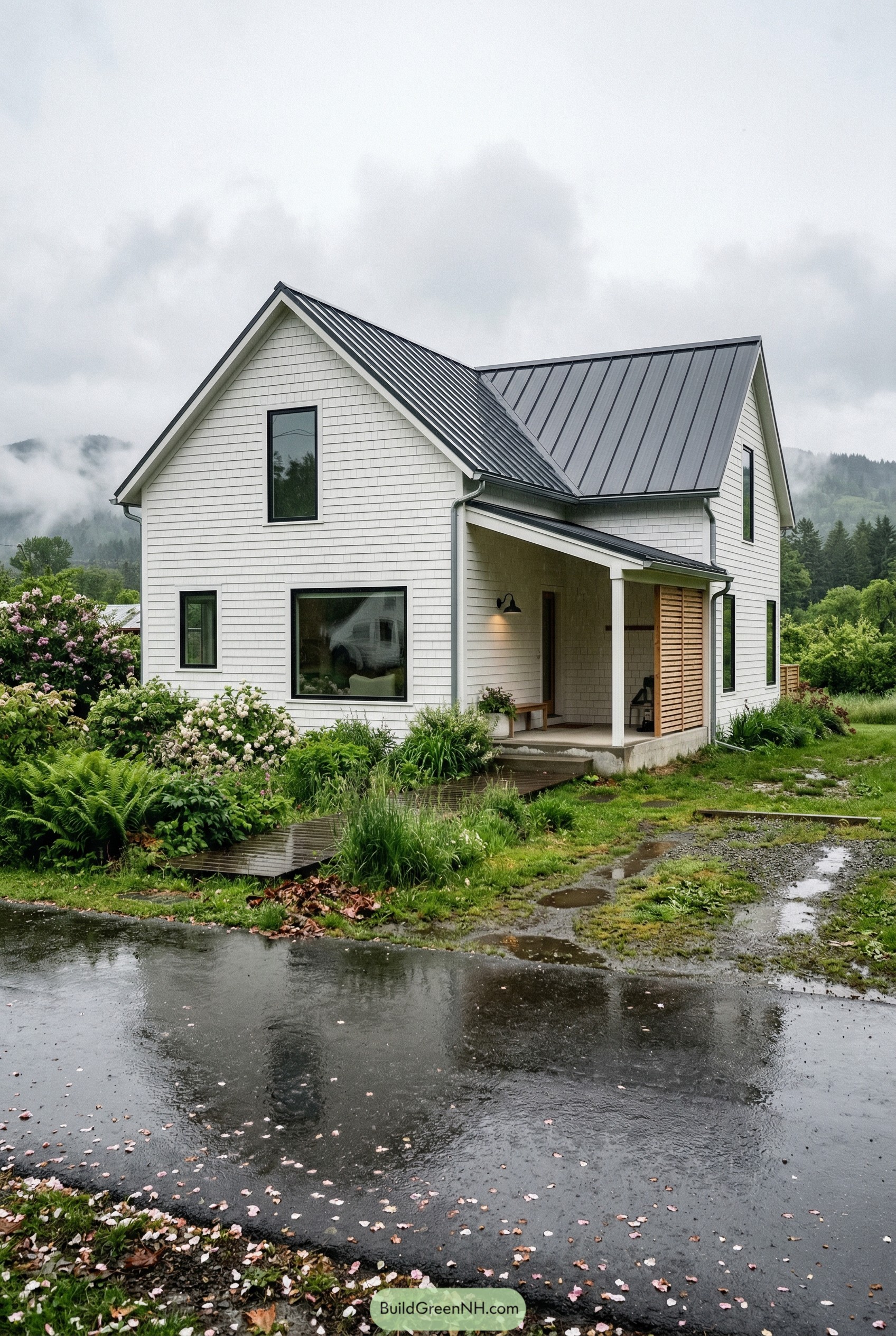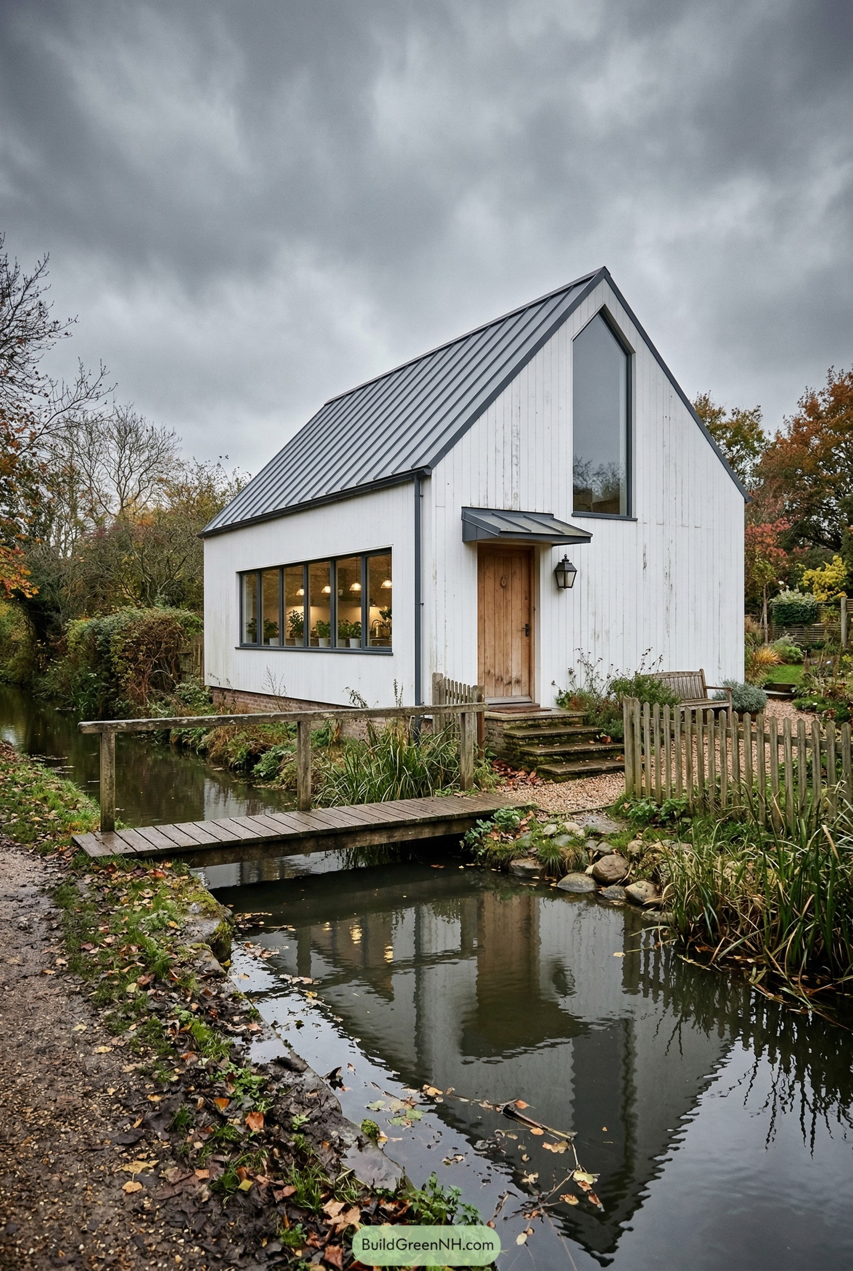 This cottage leans into simple gable lines and crisp white walls, then softens everything with that deep green door that feels a bit like a storybook secret. The black window grids and metal roof accent quietly pull it into the modern world without making it look like it tried too hard.