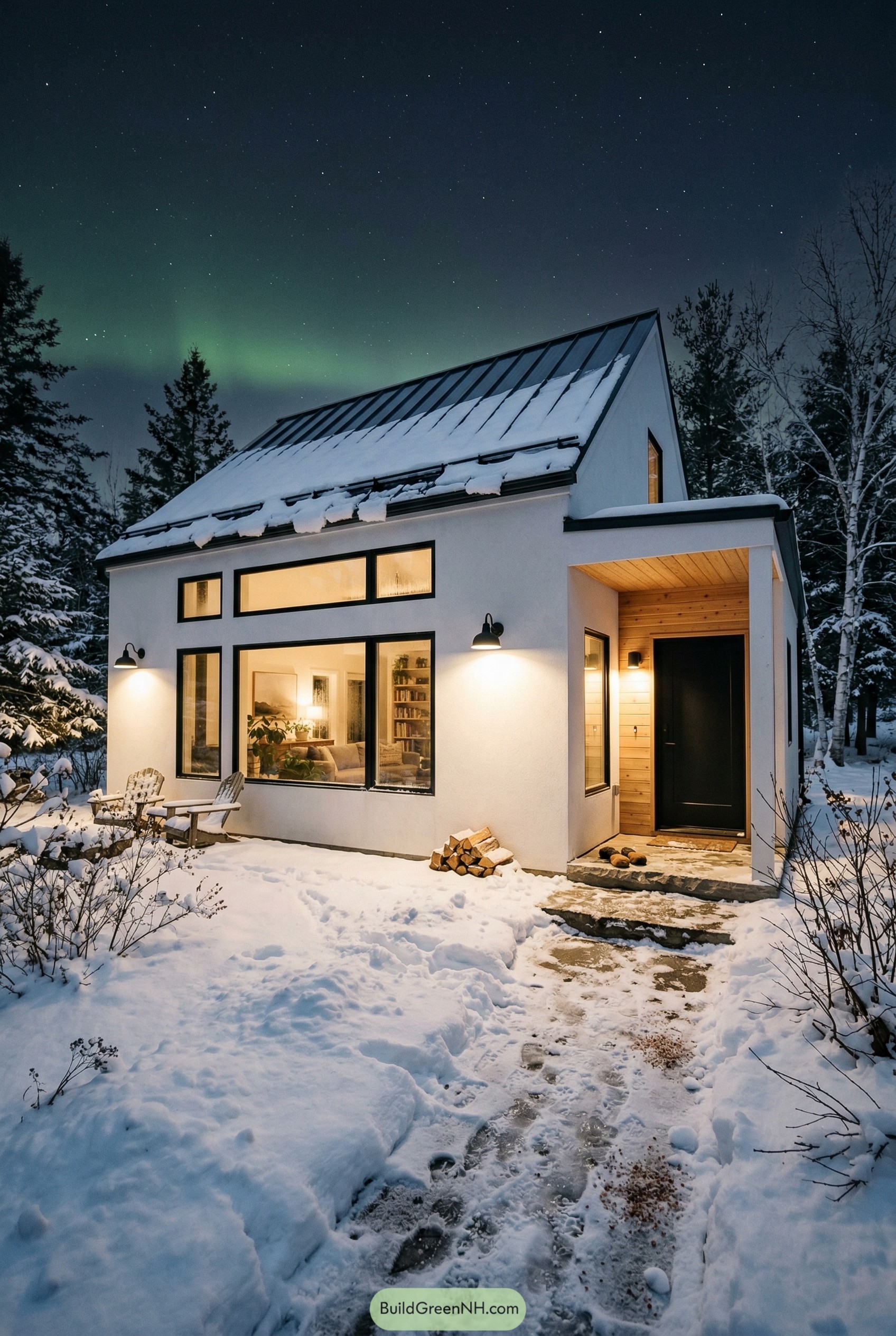 Clean white walls, a tall metal roof and those big black framed windows give this cottage a calm, quietly confident look. The form is really simple on purpose so your eye goes straight to the warm living room glow and the northern sky above it.