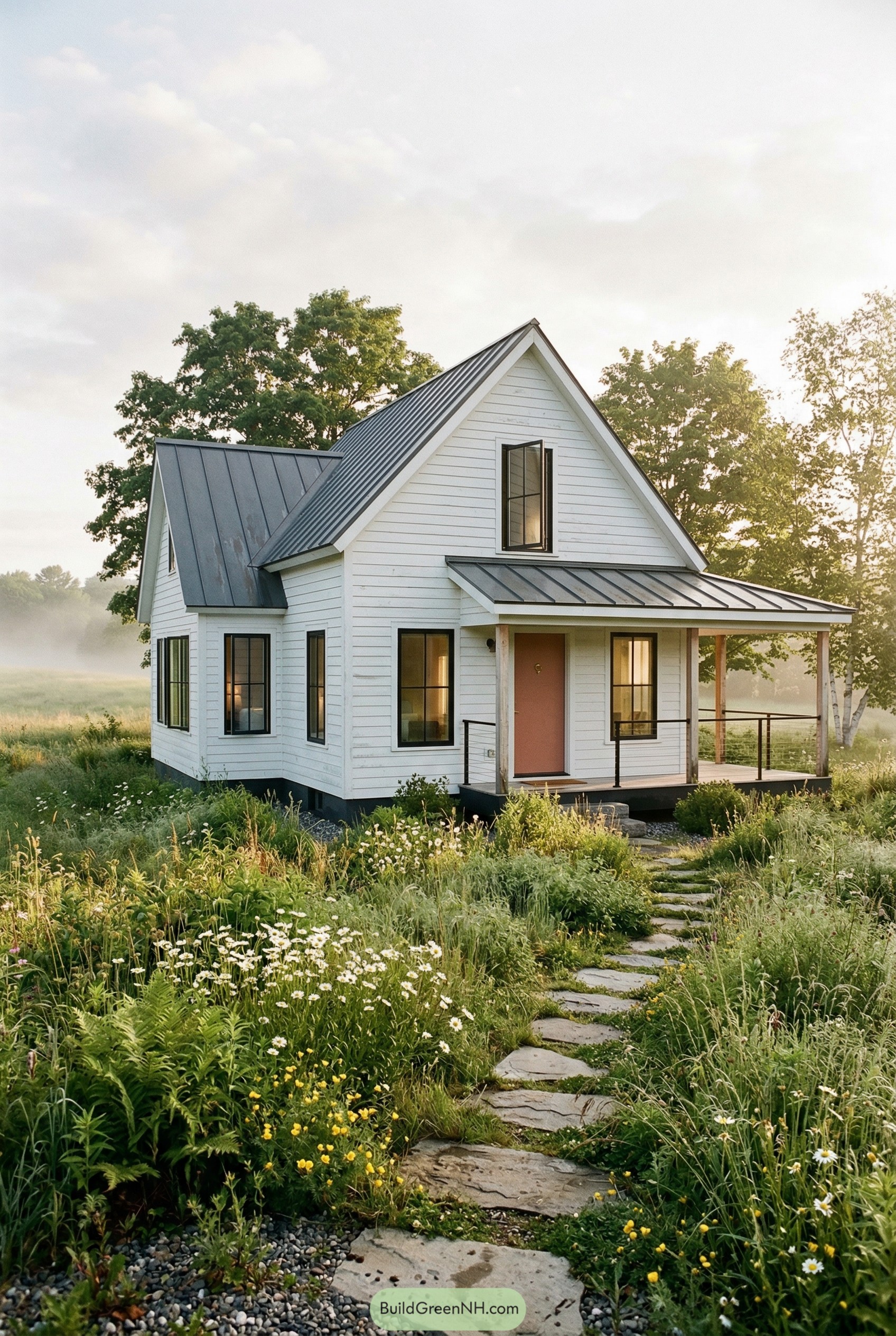 The stone path threads through relaxed meadow planting, so the walk up feels a bit like a nature stroll you get for free every morning. Slim trim, clean lines, and big windows keep the whole place feeling fresh and modern while the snug proportions make it look like it has stories to tell, even if it was just finished last year.