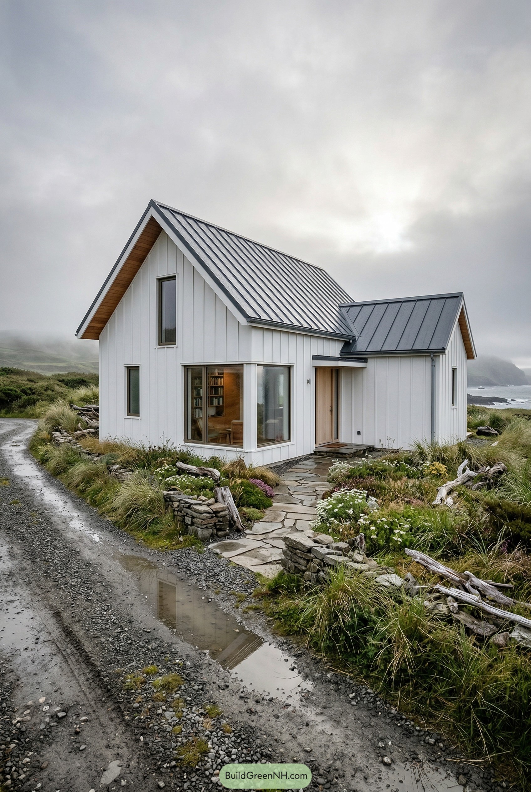 This little coastal cottage leans into a clean Nordic vibe, with simple white vertical siding and a crisp charcoal metal roof that looks ready for any moody weather. The corner window pulls the wild landscape right into the living space, so you can sit with a book and still feel part of the shoreline.