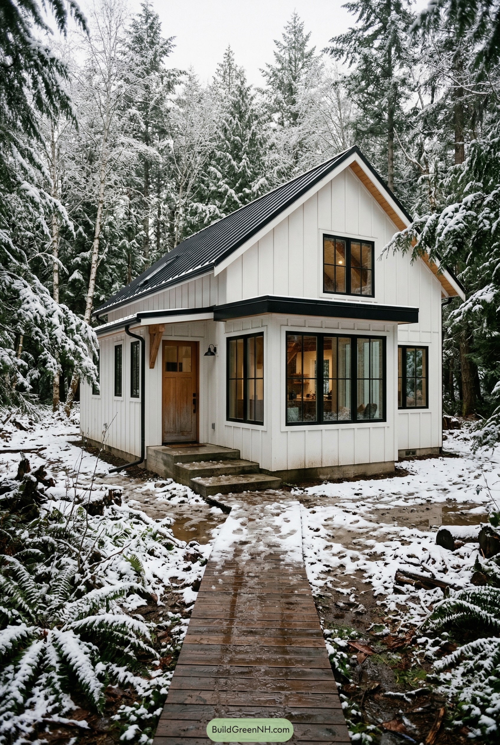 We paired the warm wood entry door and exposed bracket with the dark metal roof to make it feel both cabin familiar and crisp modern. The raised concrete steps and slim boardwalk are intentional too, keeping you above the slush and turning the short walk home into a tiny daily adventure.