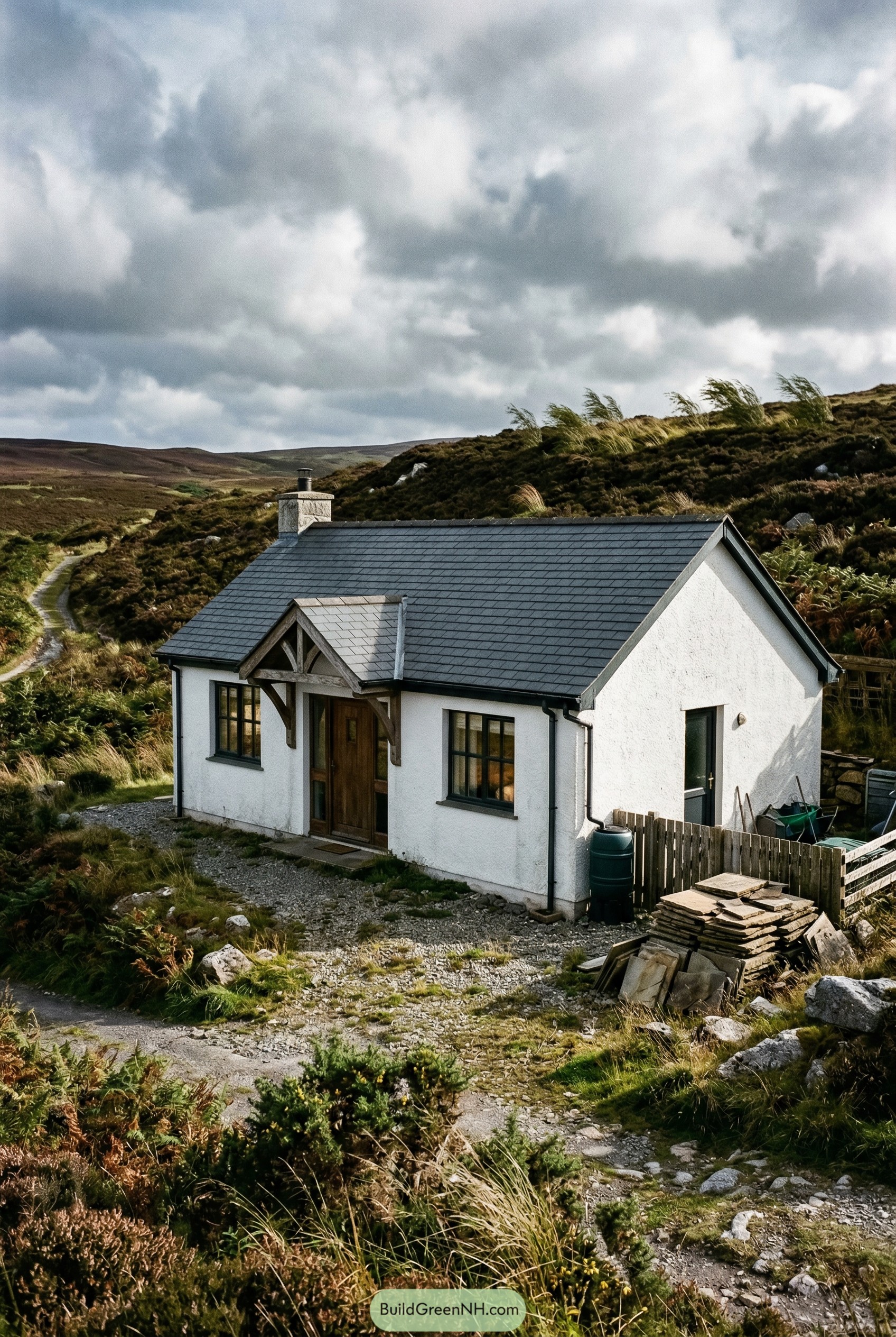 This little cottage leans into its hillside setting with simple white walls and a dark slate roof that feels calm even when the weather is clearly in a mood. The chunky chimney, timber porch frame and sturdy wood door hint that it is built for real seasons, not just pretty postcards.