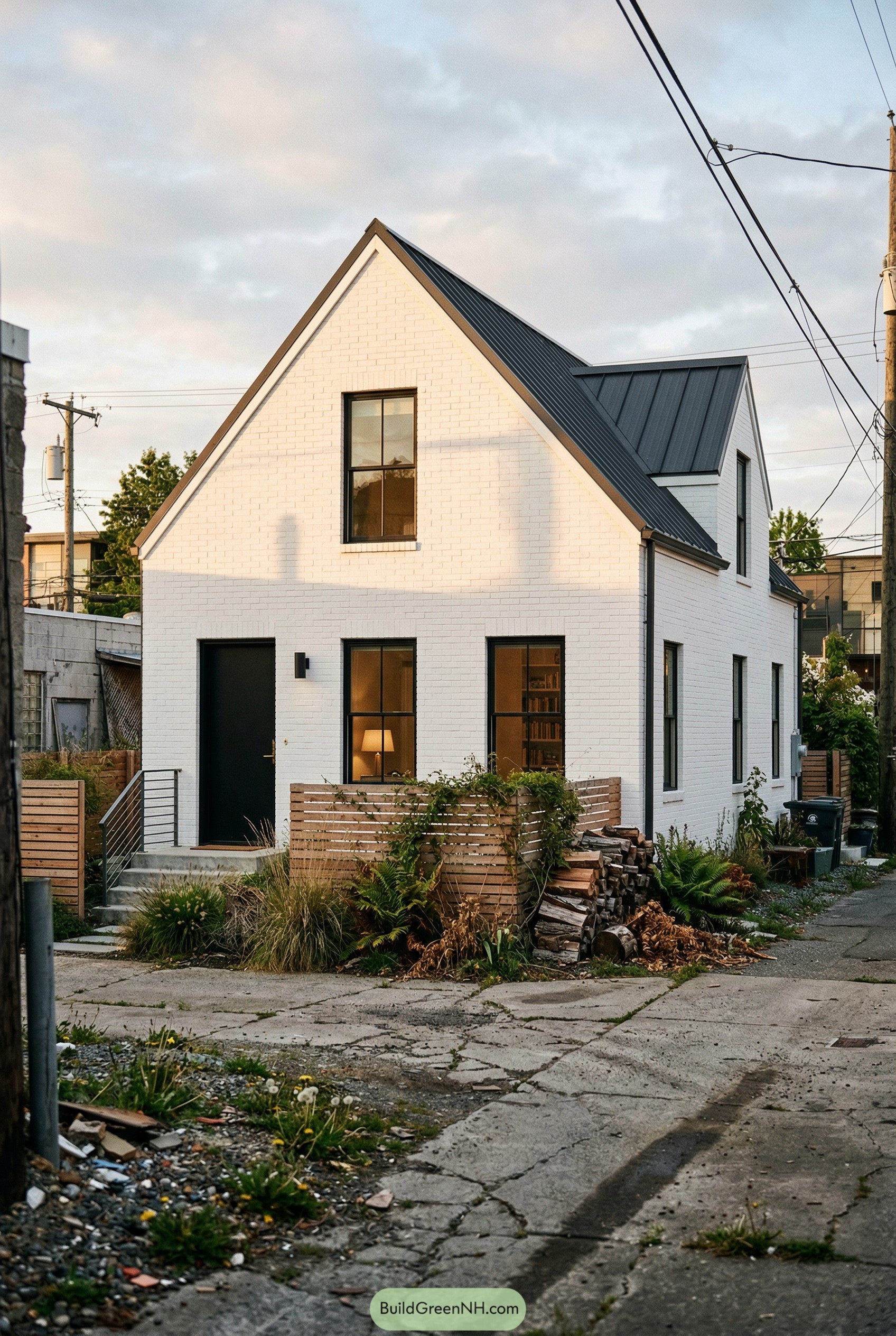 This cottage takes the familiar gabled farmhouse shape and cleans it up into a crisp white brick volume with sharp black trim. The standing seam metal roof gives it a slim profile that feels fresh and a little bit city chic, even with the firewood stacked out front.