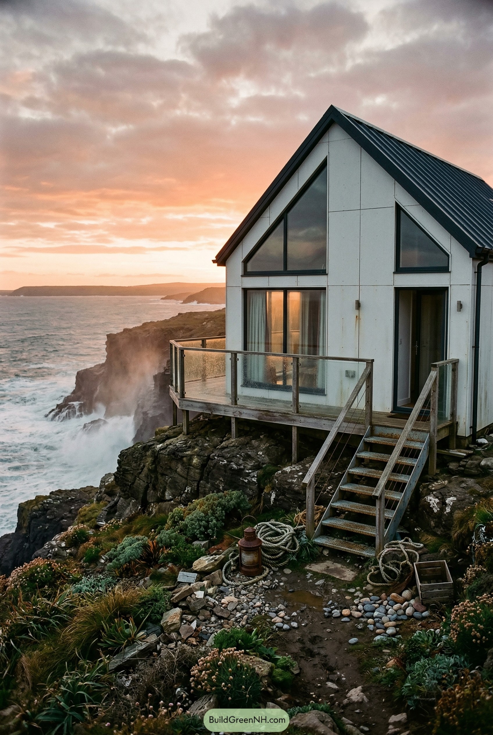 We lifted the cottage on a timber deck so it sits lightly on the rocks and gives just enough height to enjoy the spray without actually living in it, which feels like a good compromise. Weathered railings, exposed screws and the coil of rope near the stairs keep a subtle working coast vibe, so the whole place feels relaxed and a bit scruffy in the best possible way.