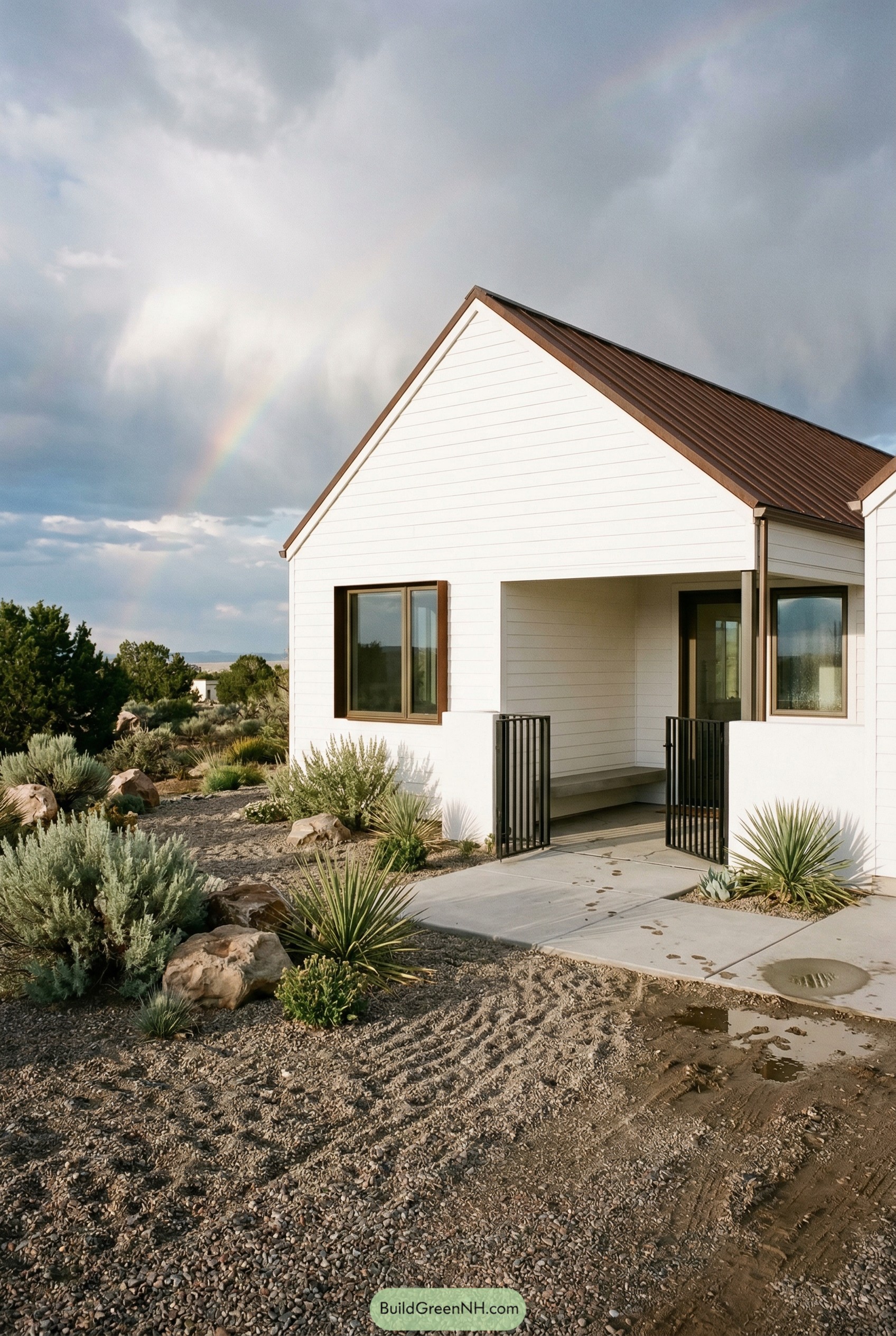 Desert plants and scattered boulders tuck the house into the landscape, so the whole place feels like it grew right out of the sand. The small covered entry, framed by black gates and a built in bench, turns the front porch into a cozy pause point and makes arriving home feel a bit like stepping into your own tiny desert courtyard.