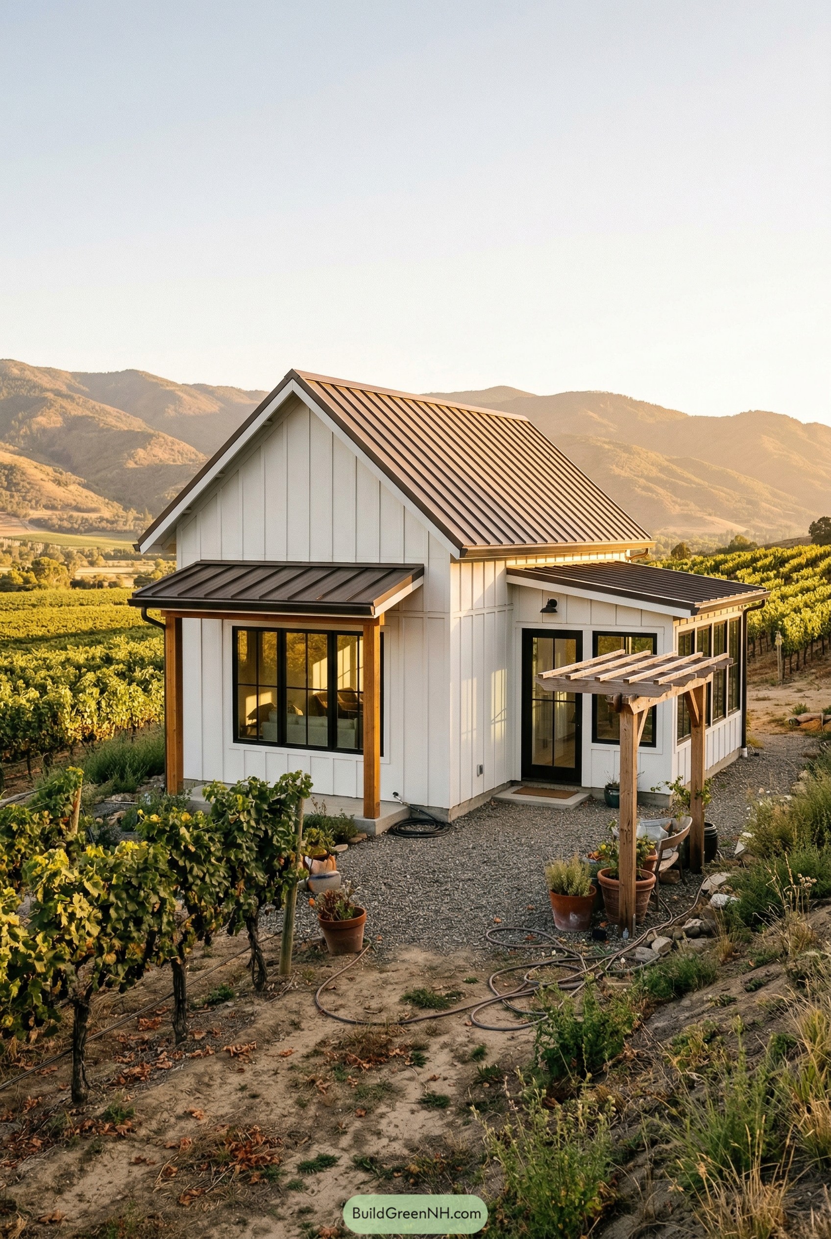 We wrapped the entry with warm wood posts and a petite pergola that gives the house a friendly face and a spot for pots and climbing greens to show off. The long, low side wing hugs the rows of vines, creating a sheltered outdoor nook that feels tucked in while still soaking up those long valley sunsets.