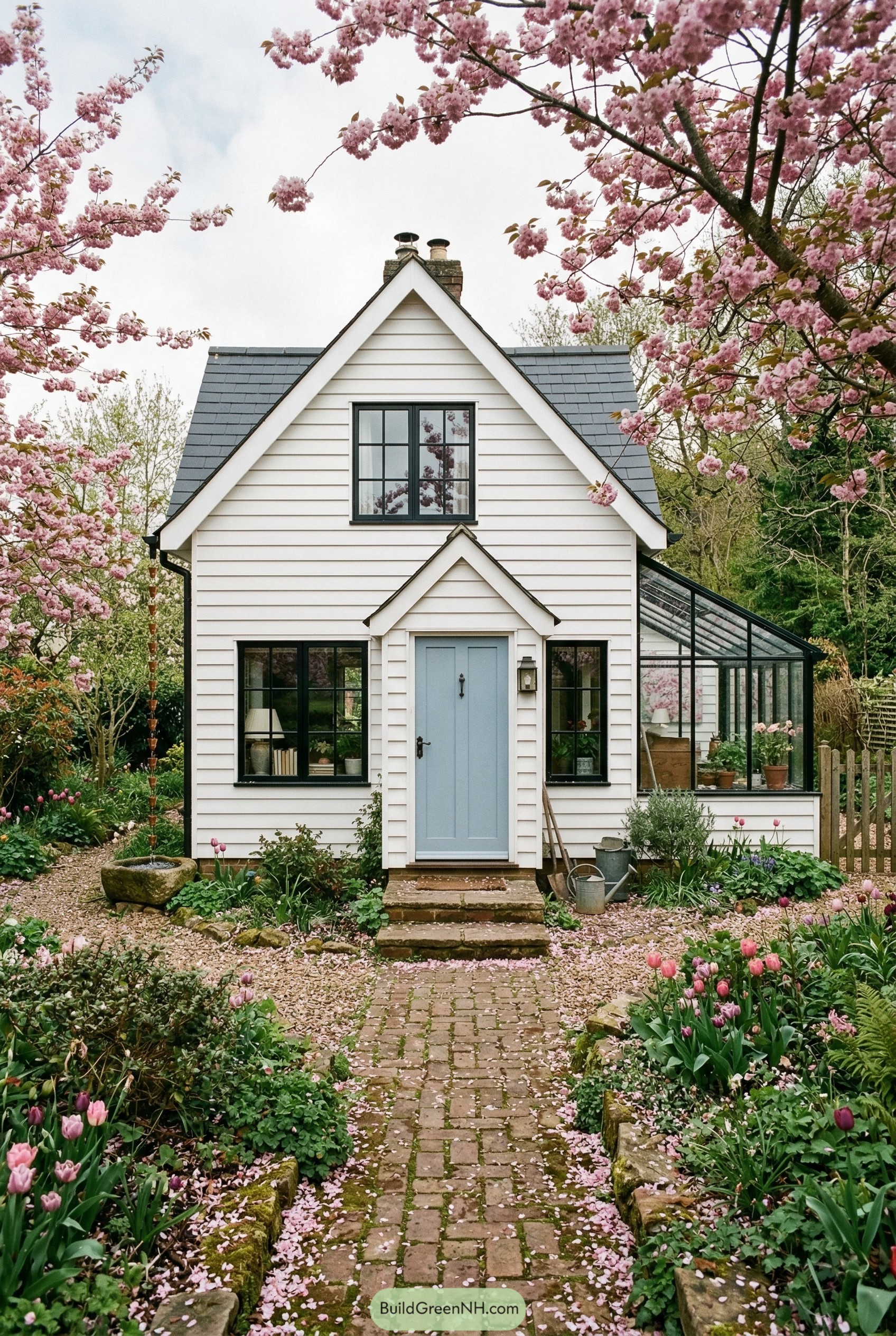 On one side, the attached glasshouse stretches out like a transparent wing, giving gardeners a sunny corner to fuss over pots and seedlings without wandering far from home. The brick path and soft gravel trails guide you through layers of tulips and lush planting beds, so the whole place feels stitched into the garden rather than just parked in it, which is exactly the kind of everyday magic we were chasing.