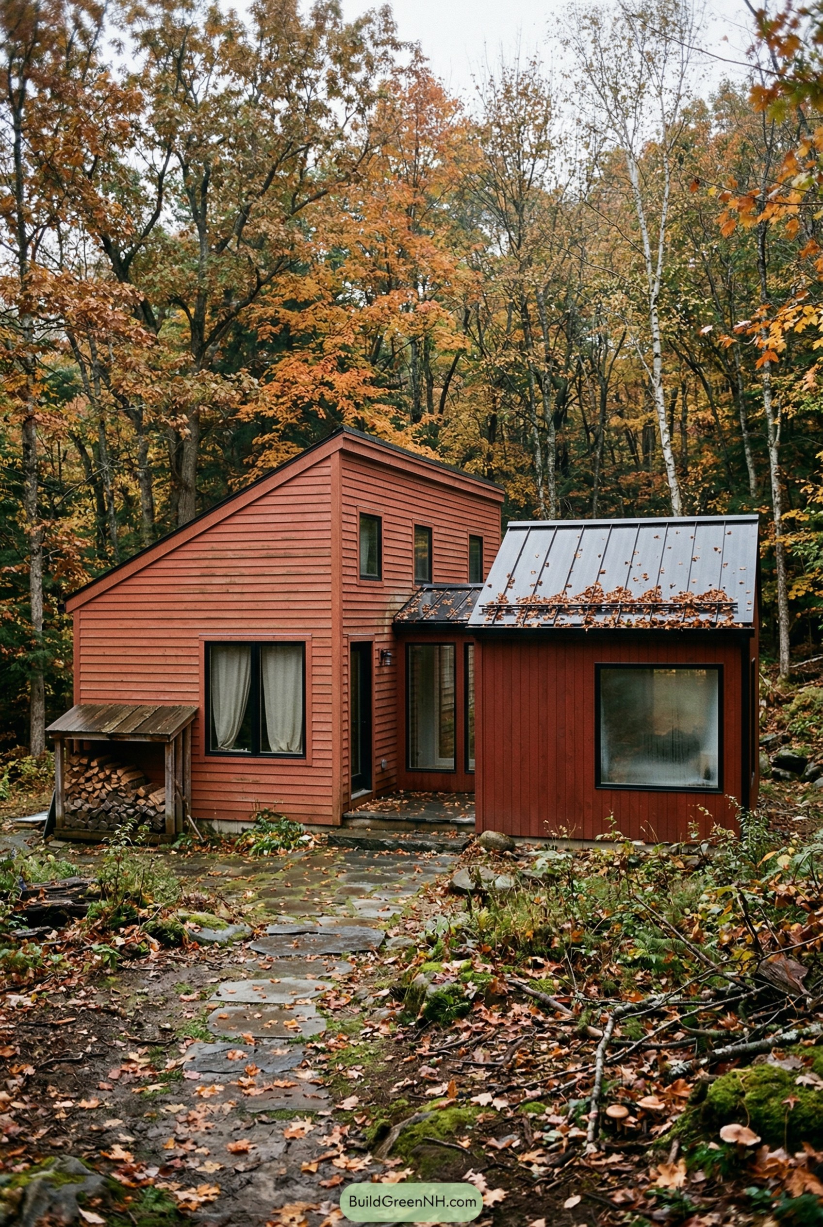 This compact cottage leans on classic barn proportions, wrapped in vertical red siding that pops against the soft woodland backdrop. The standing seam metal roof pulls the whole shape together and quietly promises that snow, rain and whatever else the weather throws will slide right off.