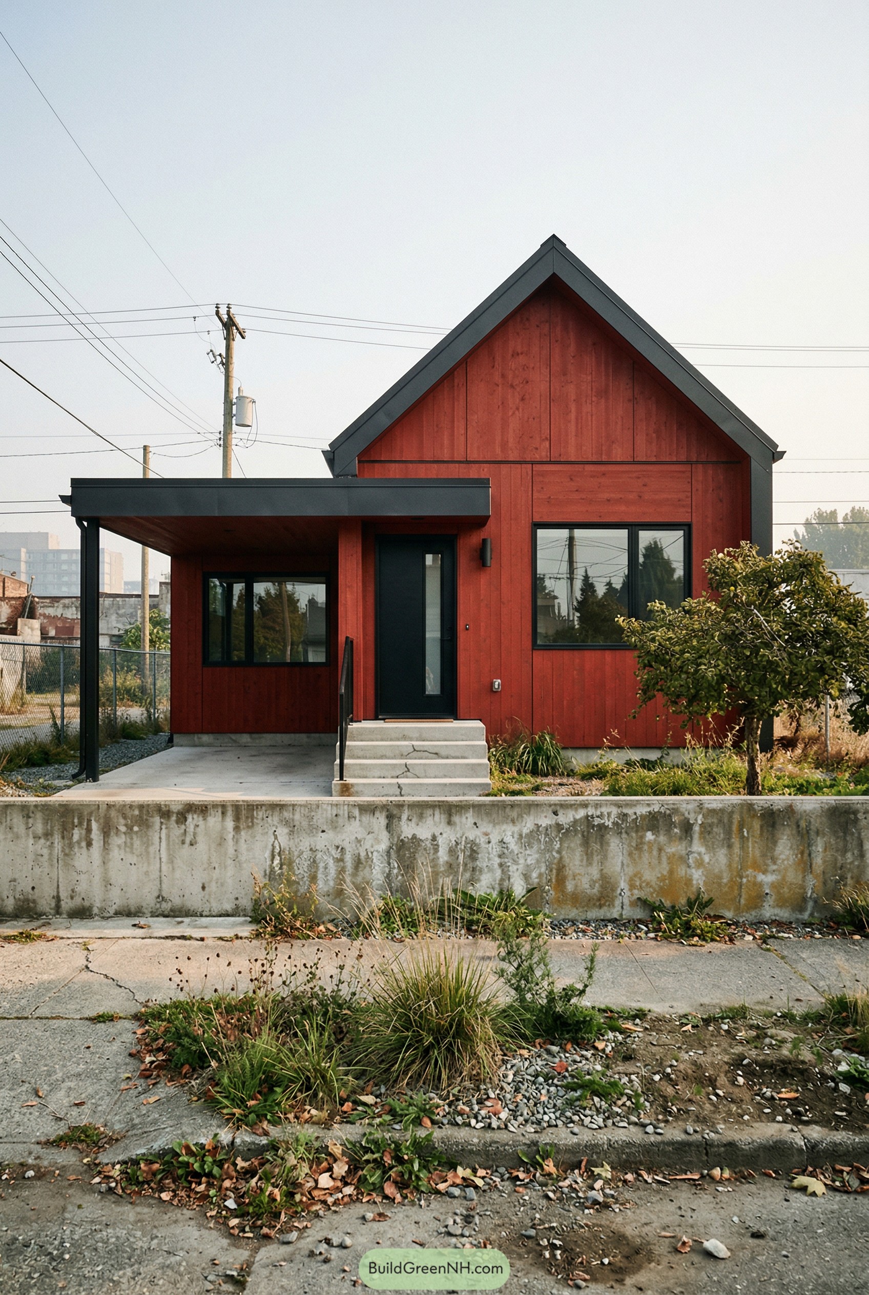 This compact red cottage keeps a clean, graphic shape with its tall gable and crisp charcoal framing, almost like a simple sketch brought to life. The front steps pull you up to a narrow entry that feels intentional, guiding you from the rough street edge into something calm and surprisingly cozy.