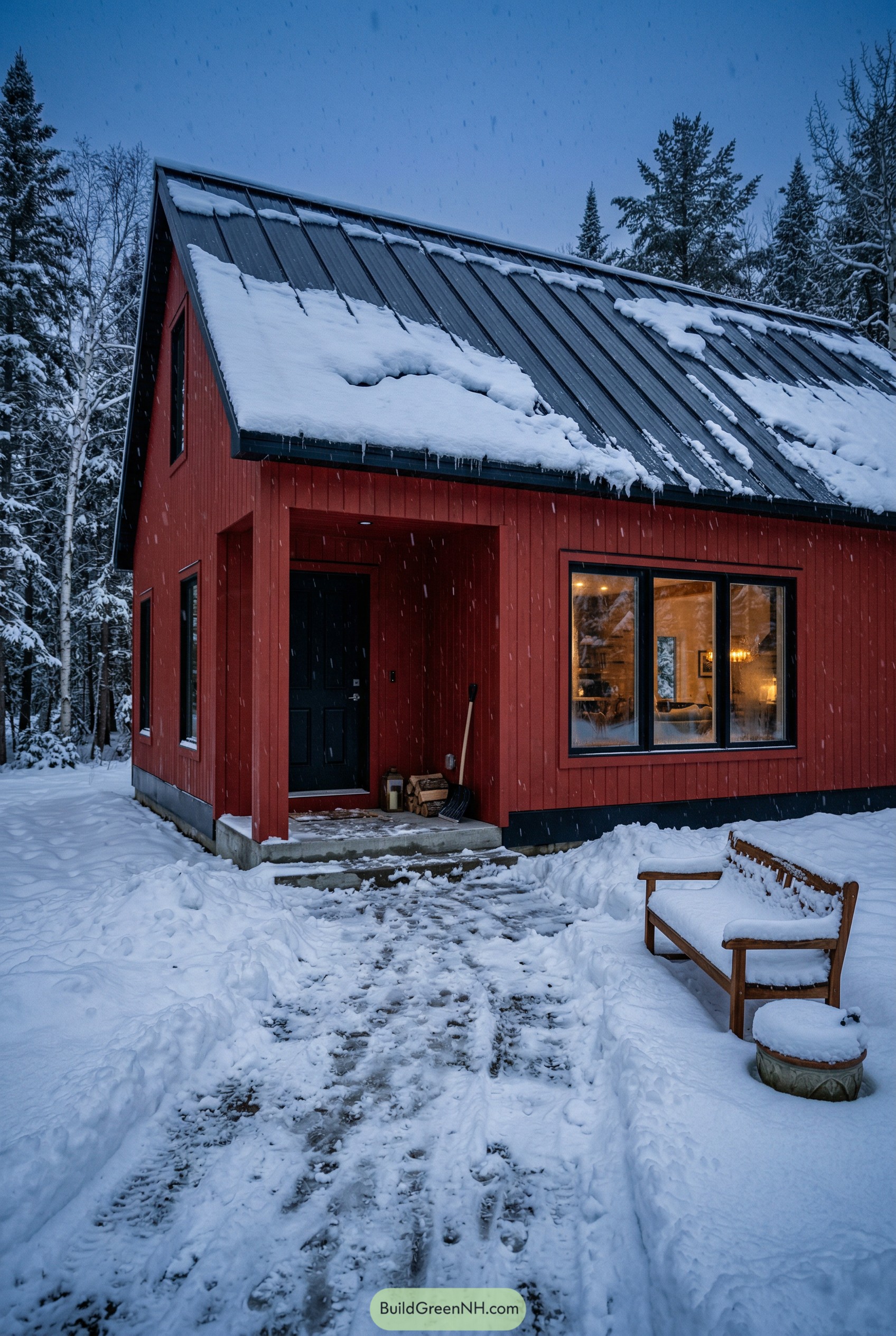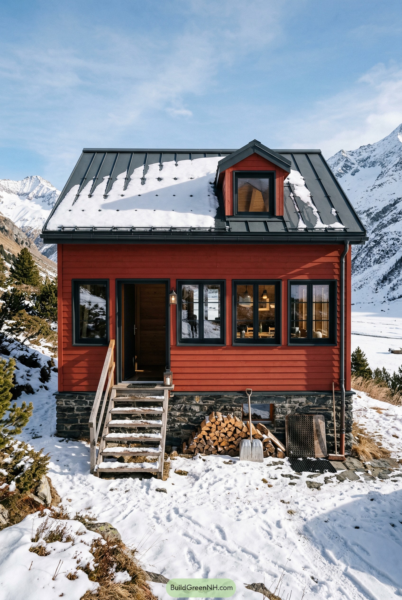 This red cottage leans into simple lines and a steep metal roof that shrugs off heavy snow like it does this every day. The deep front entry is tucked in just enough to keep boots and firewood dry, which feels like a small thing until the next storm rolls through.