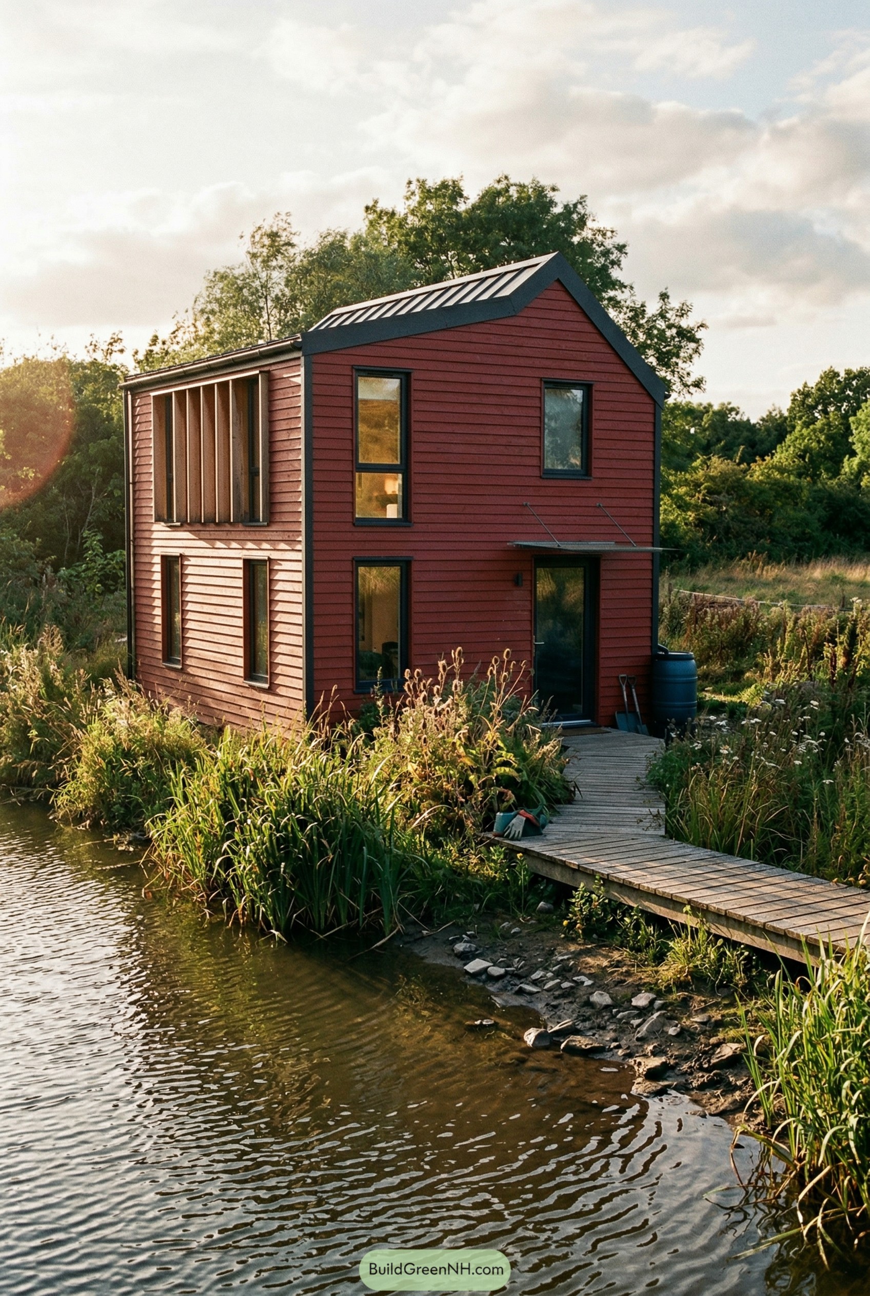 The long side wall stretches toward the pond with stacked windows and a sheltered upper opening that works like a quiet outdoor nook. A simple boardwalk entry and minimal roof overhang keep the whole place unfussy and practical, which means more time enjoying the dock and less time fussing with it.