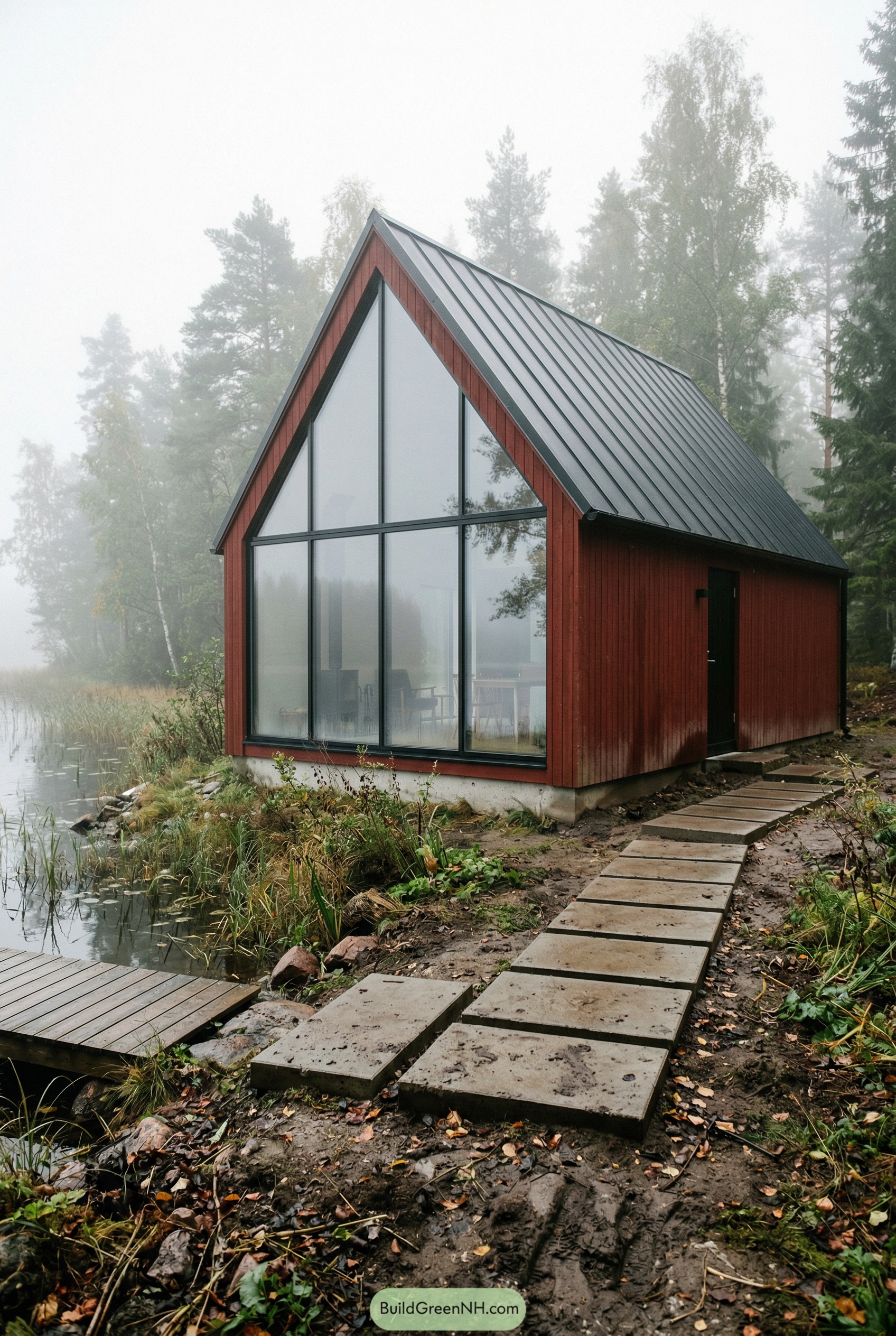 We paired the black metal roof with dark window frames to sharpen the silhouette and let the scenery stay center stage. A straightforward concrete path steps from dock to door, making the daily walk from morning coffee to canoe feel almost ceremonial, just with muddier shoes.
