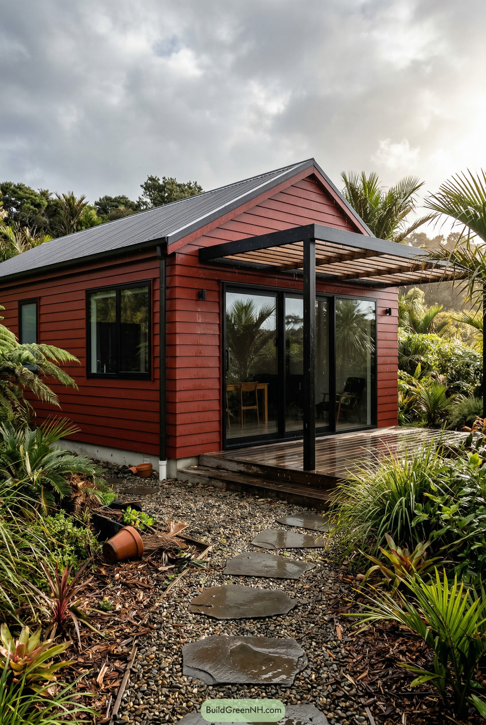 Large sliding glass doors open straight to the timber deck so the tiny footprint suddenly feels a lot bigger when you step outside. The slim pergola overhead adds just enough structure for shade plants or hanging lights, and the stepping stone path pulls you in gently, like the cottage has been waiting for you all along.