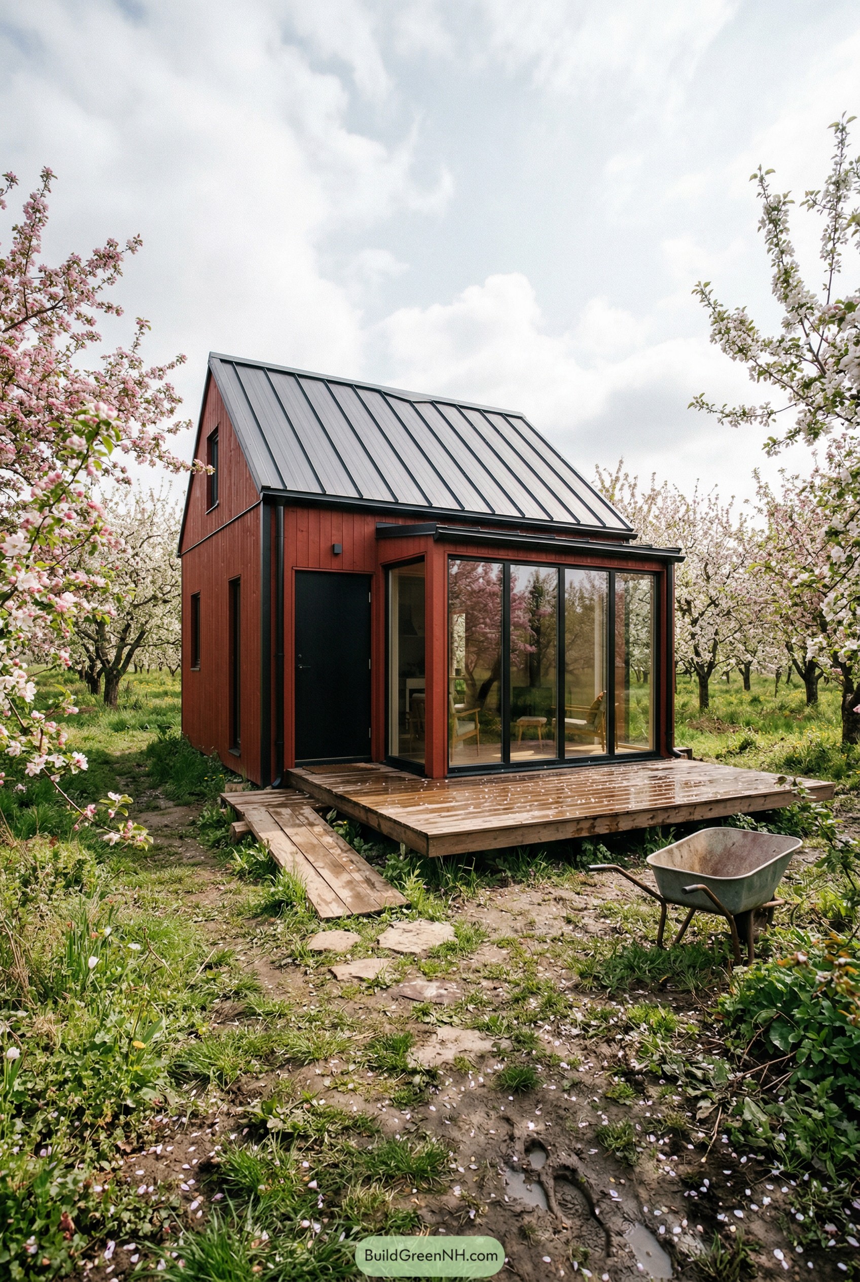 The little cabin leans into a simple gable silhouette, then surprises you with that glassy sunroom bumping out toward the orchard. Deep red cladding and slim black trim keep it crisp and modern, so it feels calm even when the trees are throwing petals everywhere.