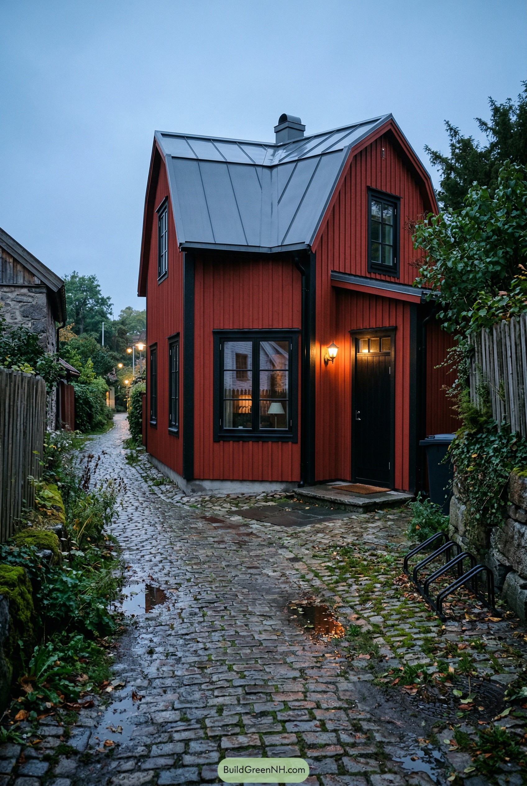 This little red gable house tucks itself into the cobblestone lane like it has always been there, even though its clean lines tell a more modern story. The tall, narrow form was inspired by old village sheds, then stretched upward to catch more views and sneak in extra living space without crowding the neighbors.