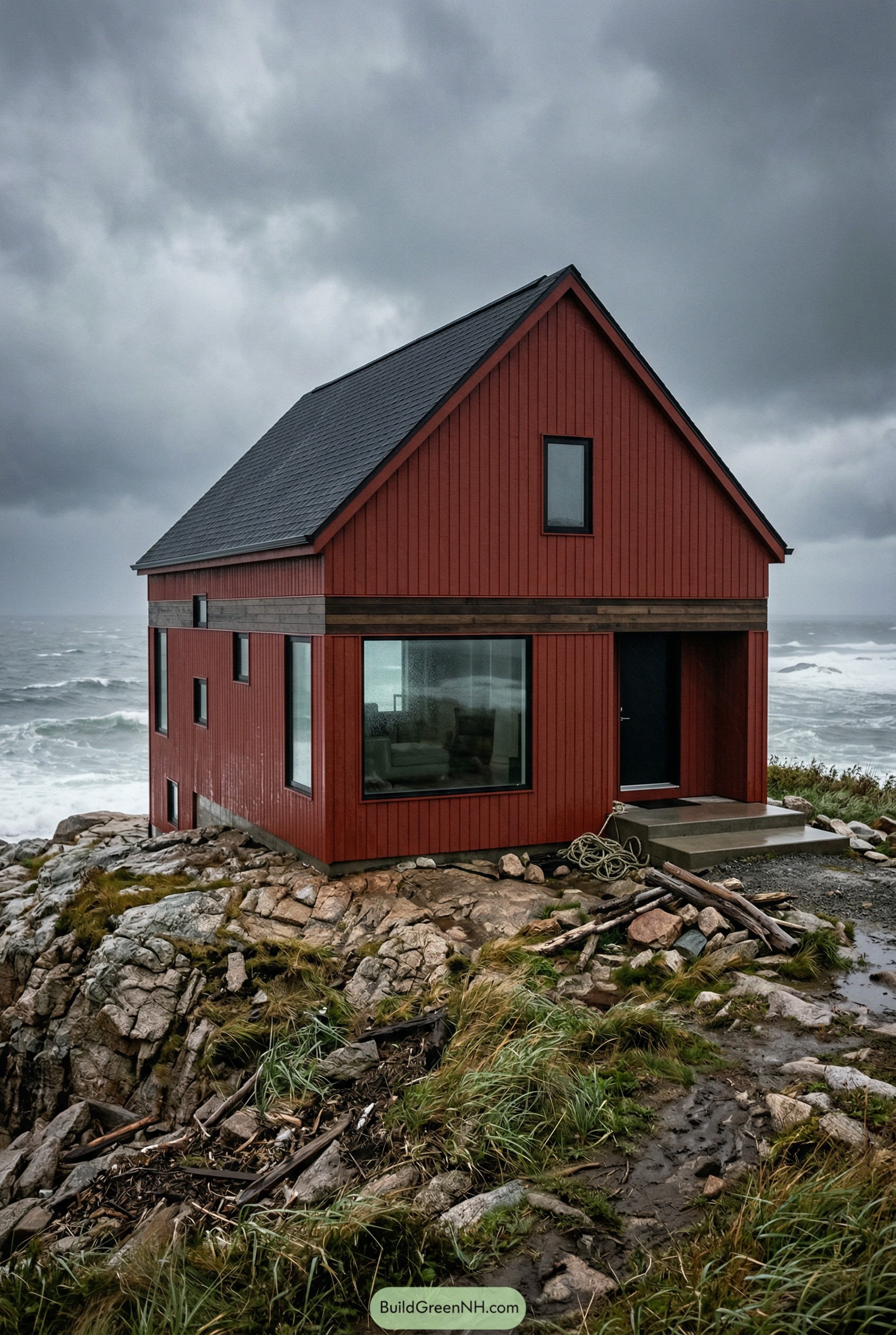 This little red cabin leans into its simple gabled form, almost like a classic barn that wandered off to the coast and decided to stay. The vertical siding stretches the walls upward while the dark band wrapping the middle visually anchors it to the rock.