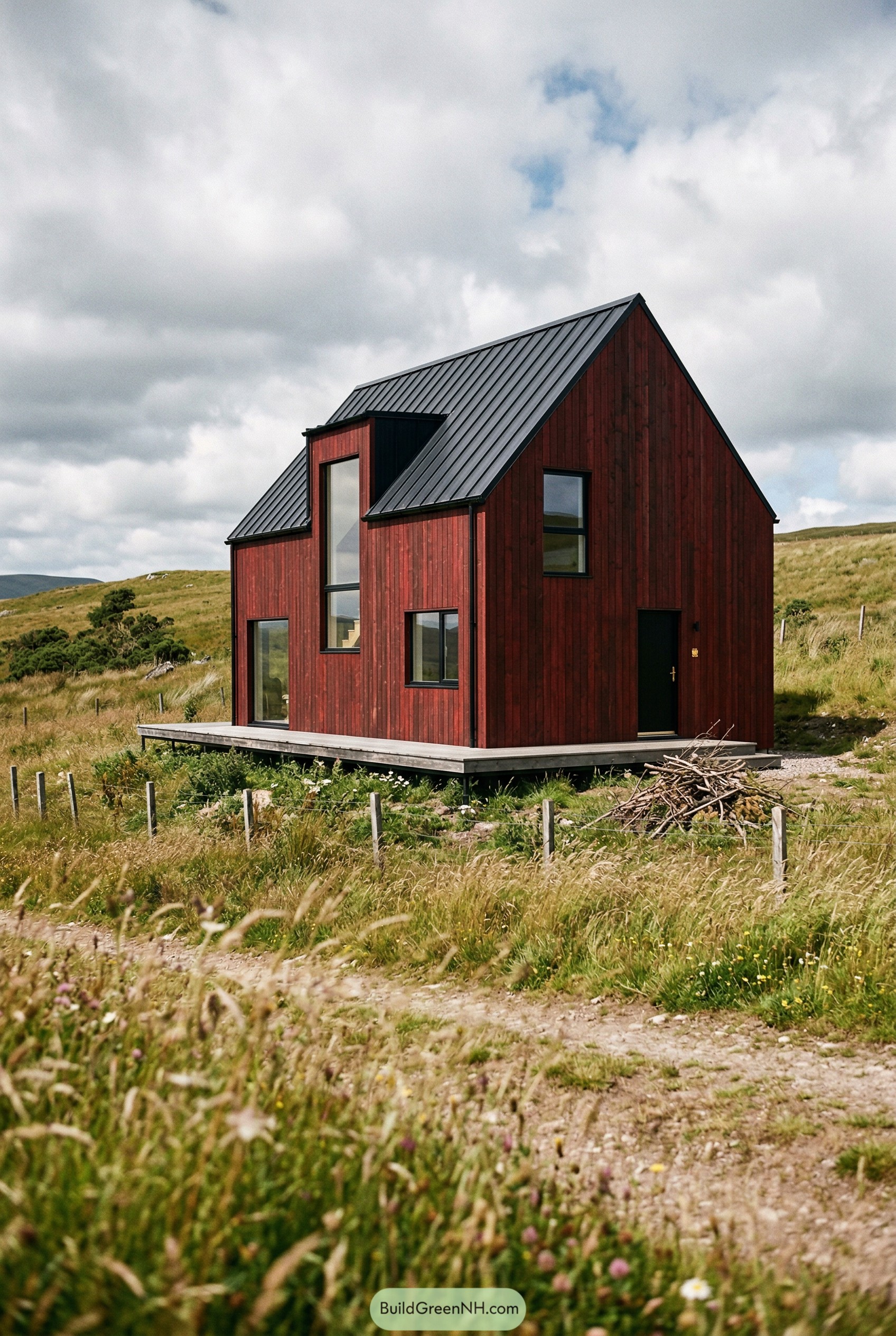 This little cabin wears its deep red siding like a cozy jacket, trimmed in crisp black that keeps everything looking sharp and modern. The simple gable roof in dark metal was chosen to handle wild weather without fuss while still feeling light next to the greenery.