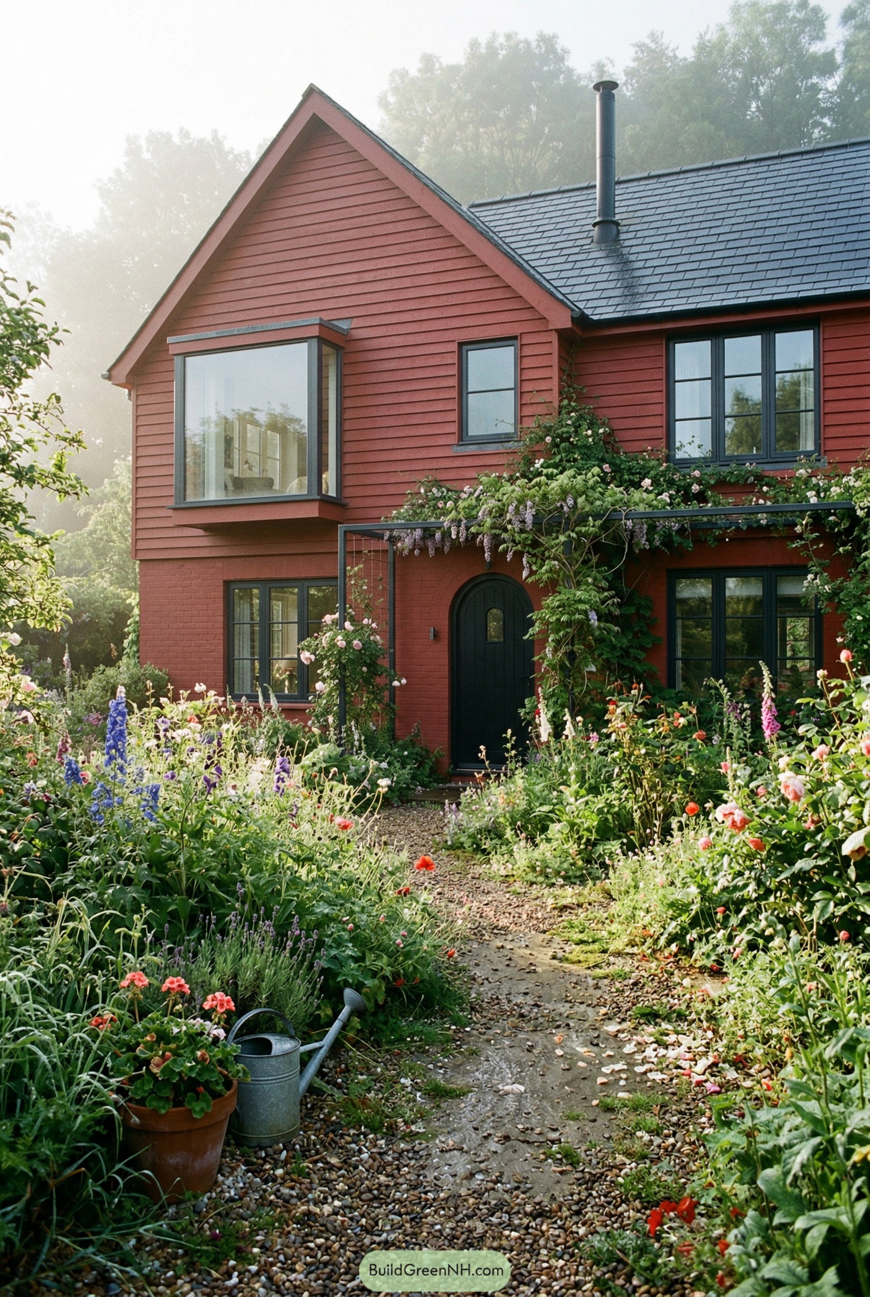 Red cottages have a way of looking both familiar and a bit surprising, and that is very much the point here.