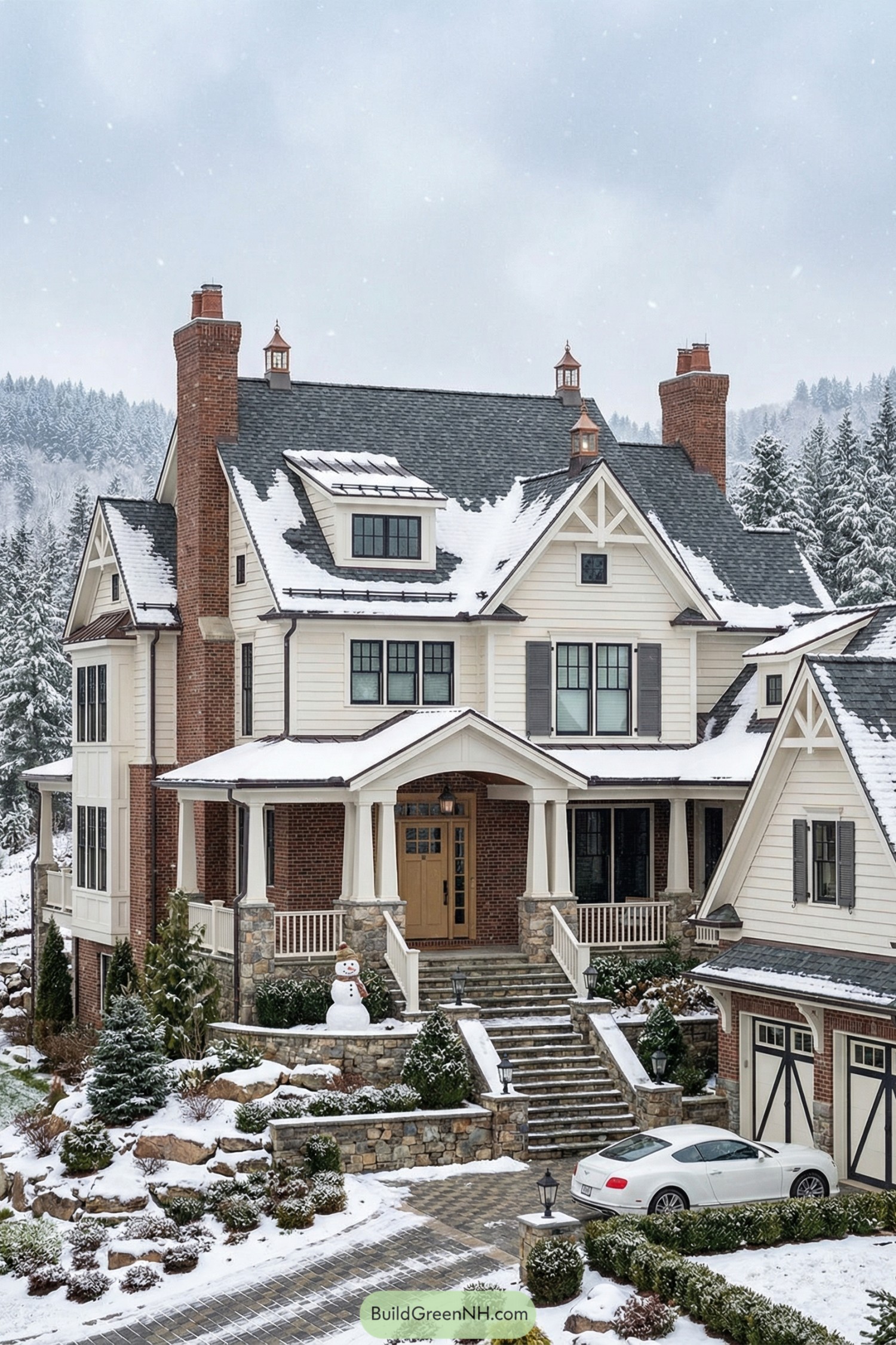 We paired warm red brick on the lower level with crisp white siding above to ground the house, so it doesn’t just float in all that snow like a wedding cake. The symmetrical windows, detailed trim, and those small attic dormers are doing more than looking pretty—they pull light deep into the interior and soften the big facade, making this grand place feel just a bit more neighborly.